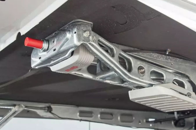 Met dit systeem kun je de vier steunpoten elektronisch bedienen via een draadloze afstandsbediening, waardoor handmatig draaien overbodig wordt.